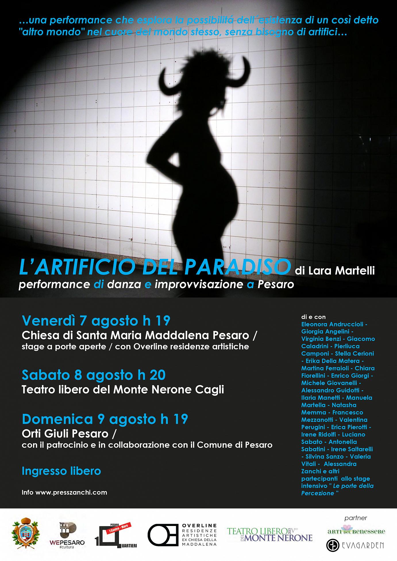 Lara Martelli danzatrice, coreografa e ricercatrice con esperienza internazionale e residente a Berlino, porta a Pesaro, sua città di origine, la performance L’Artificio del Paradiso, risultato finale di un laboratorio-stage di danza, contatto e improvvisazione in più tappe, tra primavera ed estate 2015, dal titolo Le porte della percezione - dal percepire alla creazione artistica.