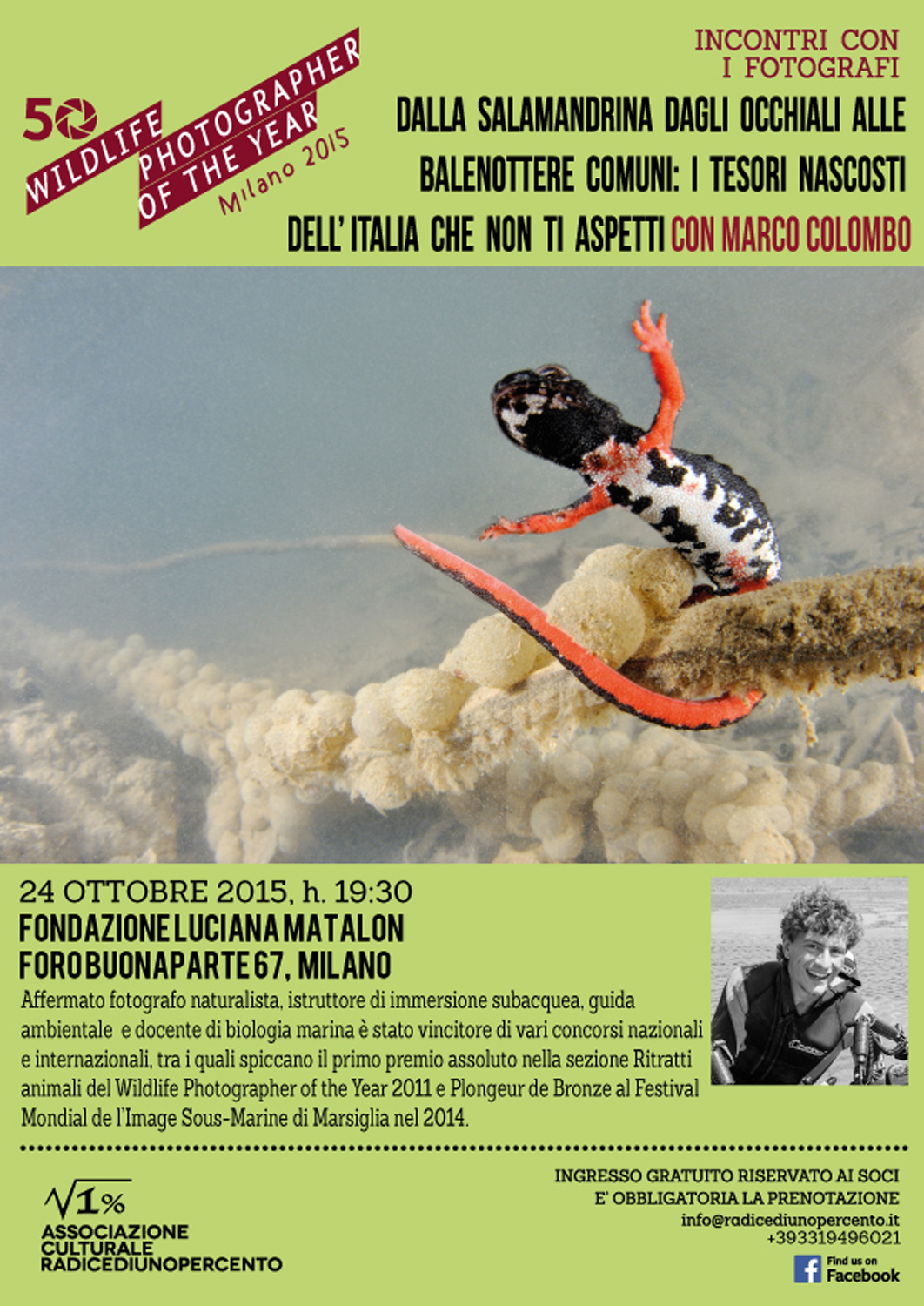 Il secondo degli appuntamenti organizzati dall'Associazione culturale Radicediunopercento è sabato 24 ottobre alle 19.30 con Marco Colombo, noto autore di reportage, che terrà l'incontro dal titolo "Dalla salamandrina dagli occhiali alle balenottere comuni: i tesori nascosti dell’Italia che non ti aspetti".